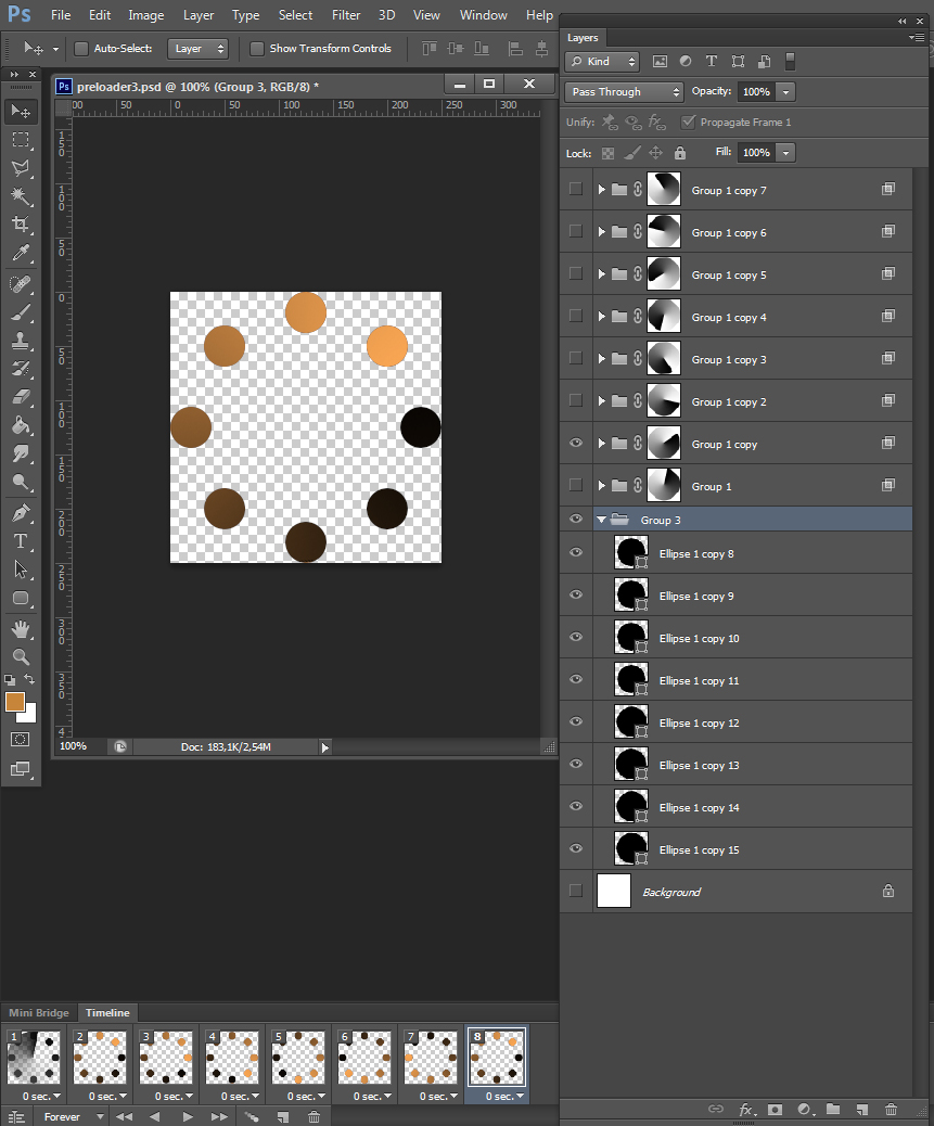 Прелаудер для сайта, урокЕсть несколько способов. Рассмотрим один наиболее верный. Самое главное определить на каком фоне будет ваш загрузчик. Можно создать квадратный документ нарисовать кружки выровнять их, от темного к светлому, либо от светлого к темному в зависимости от основного фона сайта. Дальше создаем в фотошопе анимацию по фреймам и крутим наш круг каждый раз на 45 градусов. Этот ход не верный, вы не получите точности и ваш прелаудер будет скакать на области.